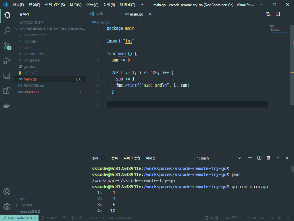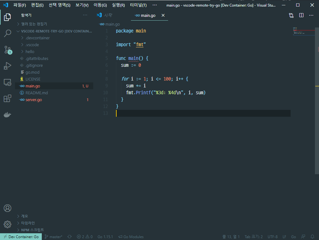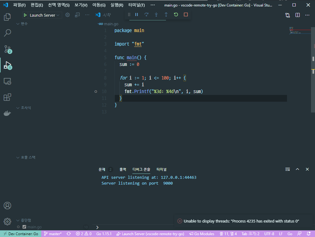 vscode tutorial 에서는 웹서버를 제공하고 있습니다. 코드를 디버깅하는 것에 관심이 있으므로 디버깅을 할 수 있는 코드를 간단하게 작성합니다. 1부터 100까지 더하는 프로그램을 server.go가 있는 폴더에 작성합니다.