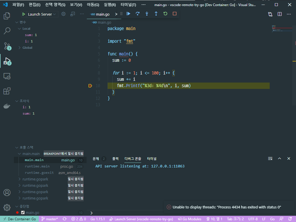 실행은 잘 됩니다. 이제 break-point를 설정하고 디버깅을 시작합니다. 10번째 라인에 중단점을 설정합니다. 그리고 디버그 화면을 열고 실행>디버깅 시작을 선택하여 디버깅을 시작합니다.